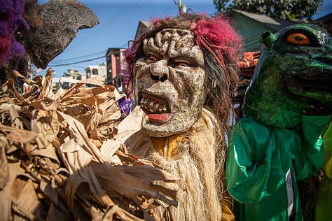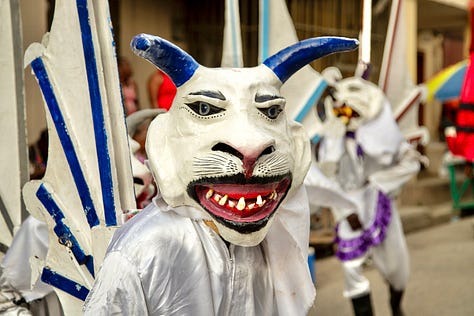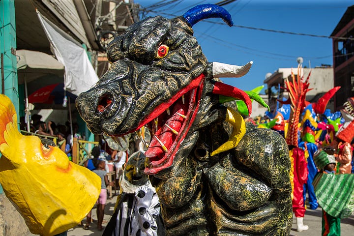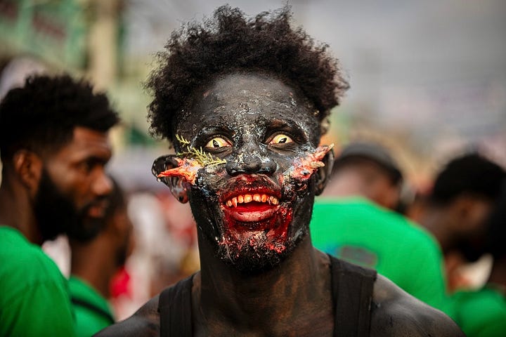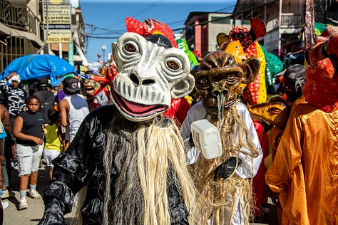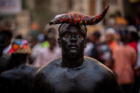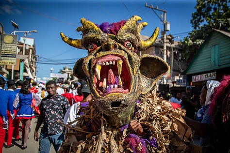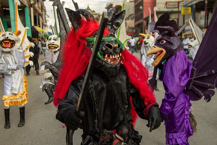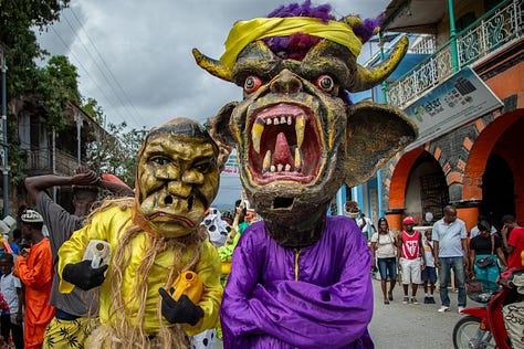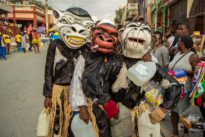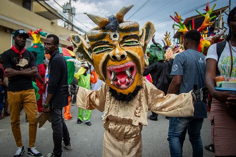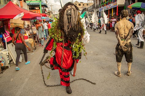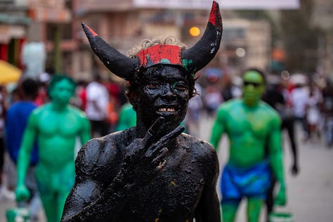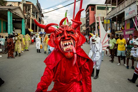 Les djab, célèbres personnages du carnaval, étaient encore accompagnés des lansè kòd pour effrayer les jeunes et les moins jeunes.