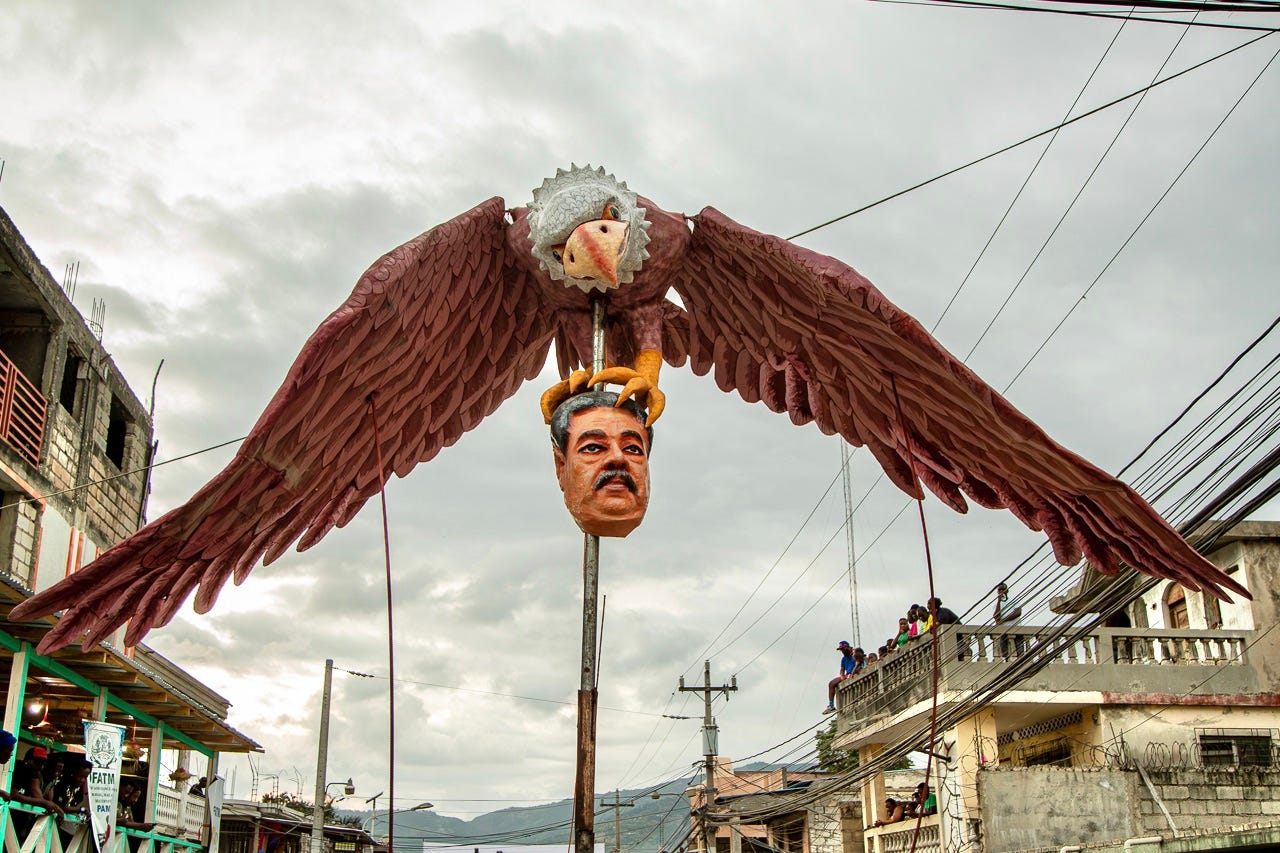 La politique internationale a aussi inspiré les artisans, qui profitent souvent du carnaval pour exprimer, à travers leurs pièces, des critiques acerbes envers des dirigeants nationaux ou étrangers. L’une des œuvres présentait un aigle à tête blanche volant avec la tête de Nicolas Maduro entre ses serres (photo ci-haut).